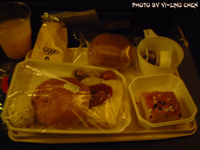 旁邊那張照片,就是飛機餐啦!就一個很簡單的麵包夾起司和蛋糕,以及一杯不怎麼樣的柳橙汁。而且,全部的餐點都是冰冷的。天呀!我怎麼會坐到這麼爛的航空公司呀!不過,旁邊那塊小蛋糕還不錯啦!有台灣在拜拜時,所有的蛋糕的味道,所以這個蛋糕是整個餐點中,我唯一可以接受的啦!