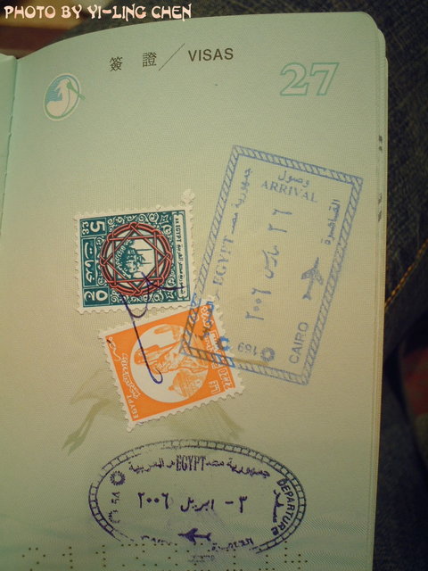 因為,台灣的國民們進入埃及是採落地簽的制度,再加上根據一些背包客的指導,所以我知道要找銀行買簽證啦!付了15元的美金,換來的是兩張郵票,另外我也將手上的10英鎊換感成了埃鎊,好以應付剛到埃及所需的花費。買了VISA接機人員,幫我們貼到護照上,就可以通關了。