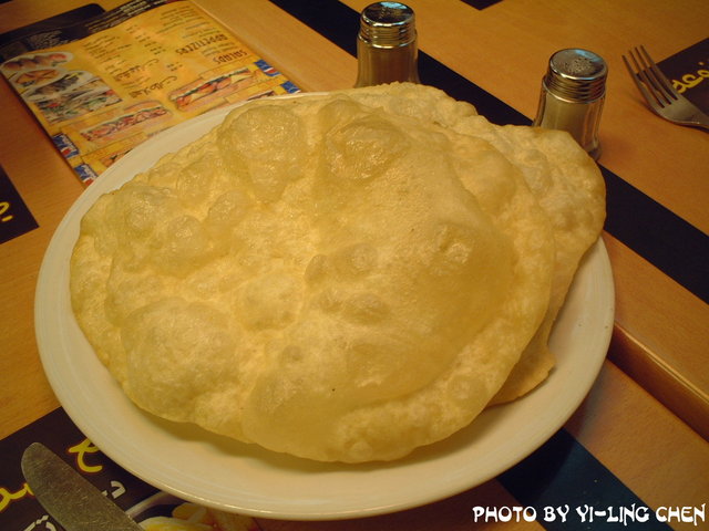 點完餐後,等了一會上桌的竟然是這個餅,問了一下才知道這是免費的配菜啦!竟然是免費的,就要來吃吃看了。這個餅的口感吃起來像是油條,只是真的很沒有味道又油膩,所以吃了幾口我就放棄囉!