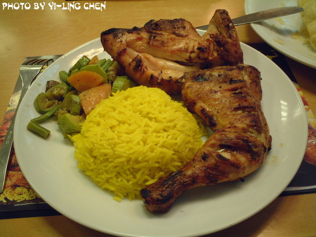 再等一下下,我點的餐就上桌了。這是半隻烤雞加飯的餐。烤雞還不錯吃,但是沒有皮脆肉軟的口感;飯看起來黃黃的好像很有味道,但是這飯吃起一點味道也沒有,實足就像是白飯加上黃色色素呀!而旁邊的配菜是還不錯,但是其中有一樣菜是苦的,所以我就挑著吃囉!這麼大一盤,我一定是吃不完的,所以就把重點的雞肉吃完囉!這一餐要價150元台幣。個人覺得是有點貴啦!因為,真的沒有這樣的價值啦!