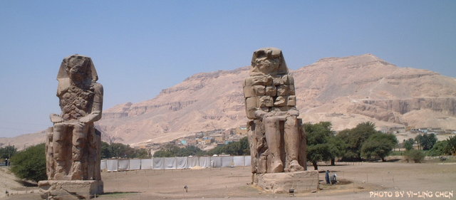 接著就是去看COLOSSI OF MEMNON,其實在很久很久以前這裡也是座神殿,但是現在只剩下這兩座雕像囉!不過,從這個角度看過去,有種他們像在保護帝王谷的感覺。而這裡,就是和這兩座石像拍拍照就結束啦!而今天的行程也在這裡畫下句點囉!