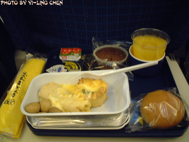 再度上了飛機,這次我終於坐到比較大一點的飛機啦!而且,也遇到一個不錯機師啦!坐了四段航程的飛機最後還是讓我遇上不錯的啦!而且,這一次的飛機餐終於是熱食啦!一看到熱熱的飛機餐,二話不說拿相機出來拍照,因為這真的太值得紀念啦!而且,這飛機餐還滿好吃的,有個磨菇、蛋餅和波菜PIE,真是棒呀!想當然,我就把他通通吃光囉!