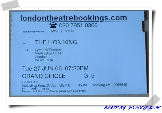 上面這就是歌劇票的正反面啦!沒錯,這一張票竟然要35鎊,而且這樣票價的位置還是在很高的地方。不過,還是給他買下去了,因為就是想看呀!後來問了那一位推薦的友人,他才跟我說“LION KING從開演到現在都沒有半價票,而且還場場爆滿。”就因為,他這一句話,我也只好認了。