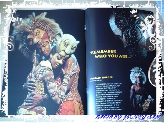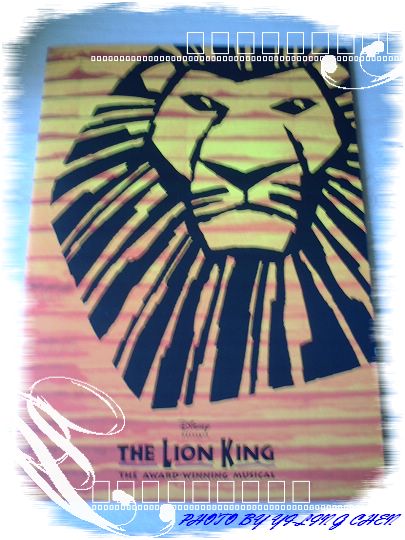 這一張照片是我翻拍自劇照本裡的某一頁。為什麼會特別拍這一樣呢?左手邊這兩個就是SIMBA和他的妻子,而右手邊的那一句“REMEMBER WHO YOU ARE...”就是當SIMBA失意覺得自己無法當王的時候,他的父親用來激勵他的。所以,右上角的那一個圖橡就是SIMBA的父親喔!