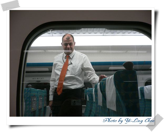 他應該是列車的“駕駛人員”吧!他本來是要離開車廂往駕駛室走了,結果看到我在拍照,就擺了這樣一個POSE給我拍囉!真是太配合啦!這應該是沒人有的了吧!因為,沒有人像我這麼無聊啦!哈哈