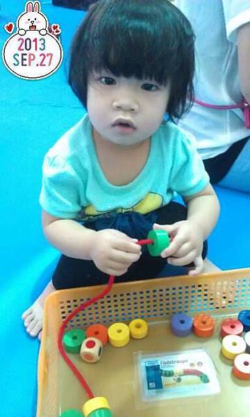 其實,這張照片是要紀錄幫貝的手指已經靈巧到可以玩串珠珠的遊戲了